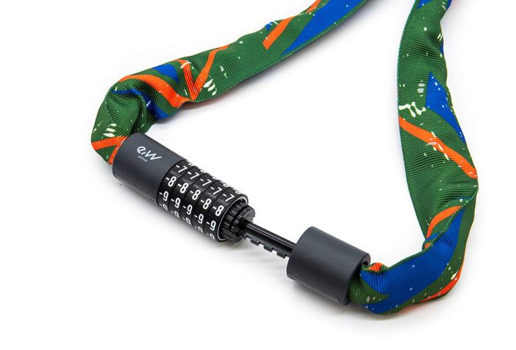 Incuietoare anti-furt pe lant cu cifru pentru trotinete electrice sau biciclete cu imbracaminte textila si design inedit
