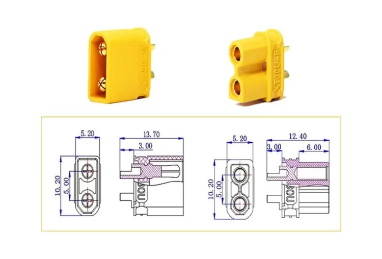 Set conectori XT-30 (mama / tata) pentru mufele de alimentare cu curent al trotinetelor electrice. Mufele de tip XT-30 suporta un curent de 15 Ah cu voltaj nominal de pana la maxim 500 V. Acestea au o rezistenta la caldura de pana la 120 de grade celsius. Pachetul contine 1 set mufe XT-30 mama si tata.