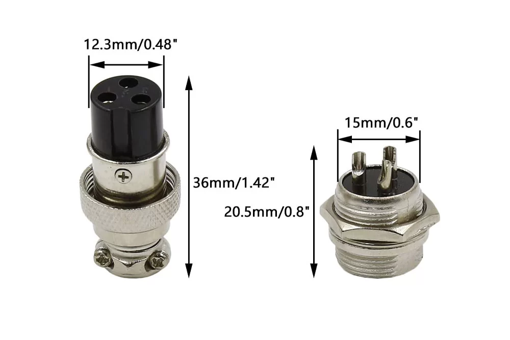 Set mufe cu 3 pini incarcare GX16-3P (mama / tata) pentru trotinetele electrice. Connectorii de tip GX16-3P suporta un curent de 7 Ah cu voltaj nominal de pana la maxim 125 V. Pachetul contine 1 set mufe GX16-3P mama si tata.